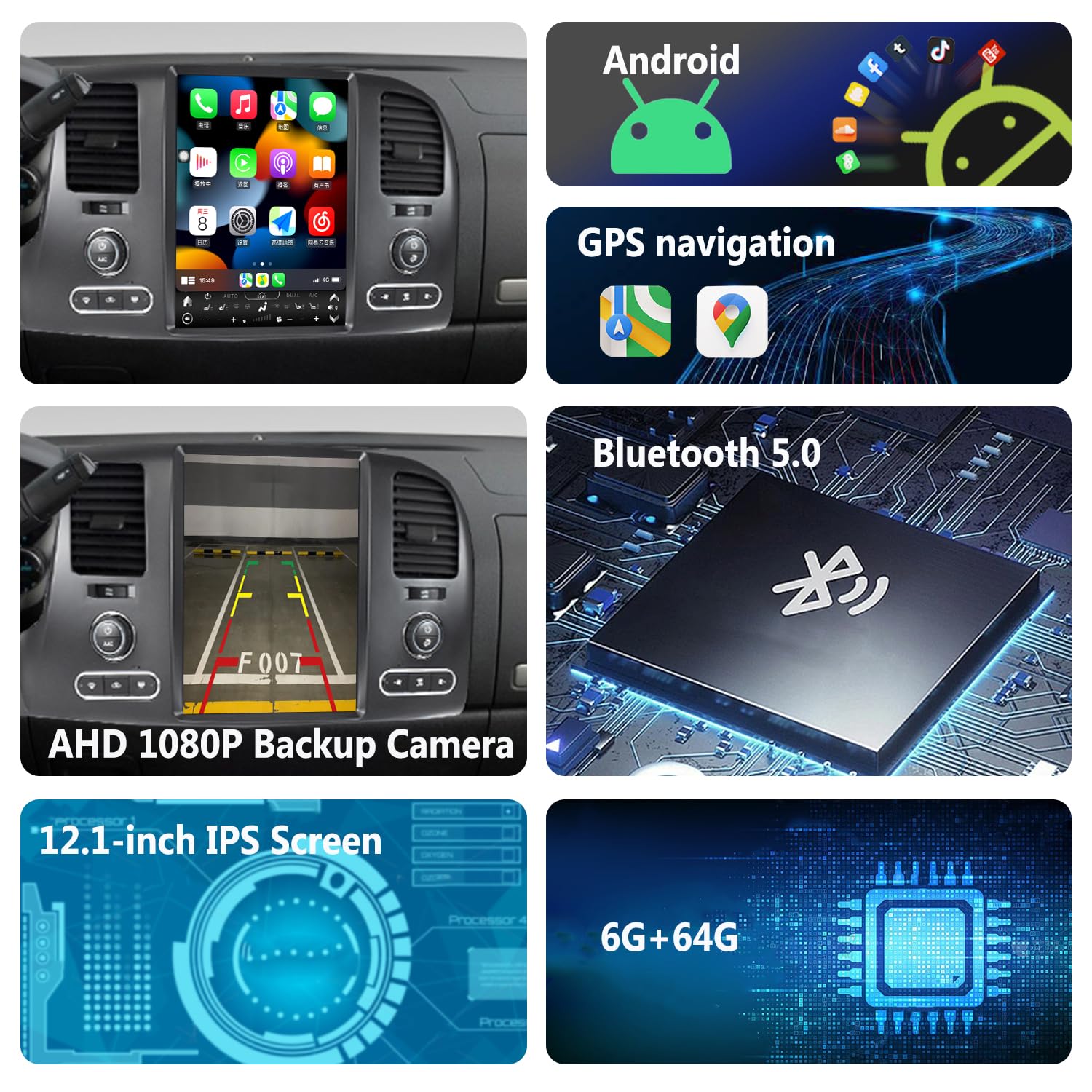 • 🚘【Upgraded Android Radio For Chevrolet Silverado GMC 2007-2013】: 12.1-inch T-style Radio for Chevrolet Silverado GMC 2007-2013, this Android Car Stereo Vehicle navigation uses vehicle GPS (global positioning system) in conjunction with electronic maps. It can conveniently and accurately tell drivers the shortest or fastest route to their destination. It is a good helper for drivers and is plug-and-play. Used, no additional wiring or cutting required, perfectly consistent.